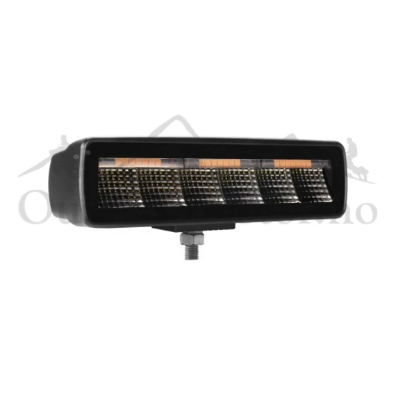 Arbeidslys og varsellys i samme lampen, sotet glass med 6 stk. Osram 5W LED. 10-30V. Flood. 2280 lumen, 1727 effektive lumen, 5700Kelvin. Aluminiums hus. Dim: 157mm x 44mm. Dybde: 60mm. Leveres med 50cm lang kabel ut fra lampen med egen kabel for varsellys og for arbeidslys. Sort brakett i rustfritt stål med gummipakning. IP69K. AR godkjent. (R23) (Godkjent som ryggelys).