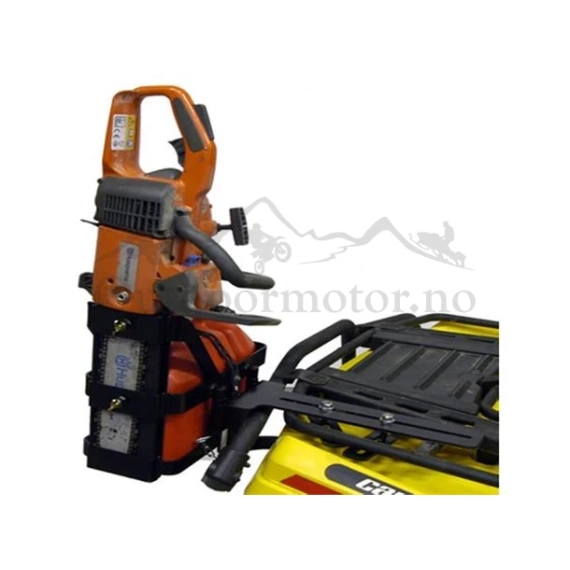 Motorsag og bensinkanneholder for plassering bak på ATV