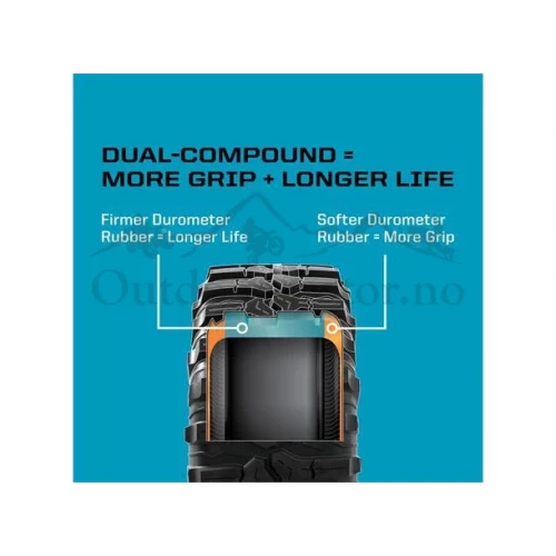 • Dekkets ytre kant har en mykere durometergummi for trygg svingytelse, overlegent grep og følelse