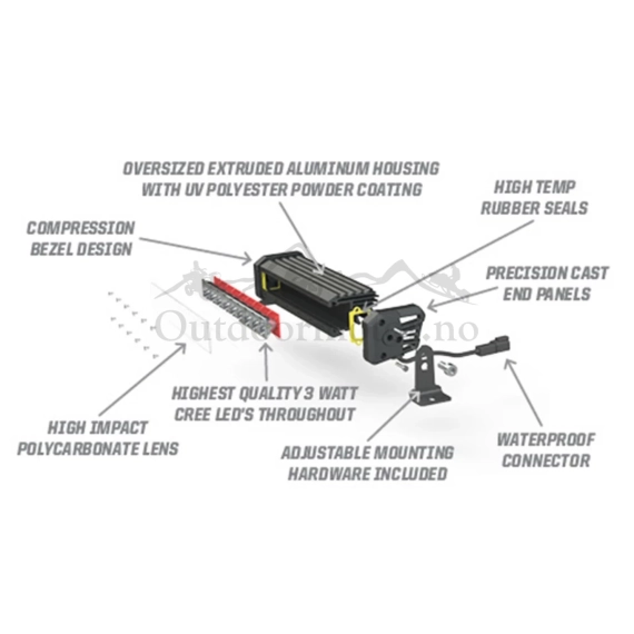 Beskrivelse Slå tilbake natten. Forleng kjøreopplevelsen til langt ut på natten med tillegg av høyintensiv tilbehørsbelysning. Enten du trenger å kaste en stråle godt nedover stien eller bredstrålende ytelse for å se hva som ligger rundt deg, tilbyr vi belysning for å slå tilbake mørket. Denne Pro-Armor 30 in. Dual Row Light Bar leverer ekstrem ytelse, med to rader med høyintensitets LED-armaturer og kombinasjonsoptikk for et ekstremt allsidig strålemønster. Armaturet er utstyrt med overdimensjonert varmesynkronisering for å holde lyset i gang tur-etter-tur i timevis. Plassert i en robust 6061 aluminiumslegering med en bruddbestandig polykarbonatlinse designet for å holde vann og støv ute, er du klar til å kjempe natten med en ustoppelig ytelse. Elektronisk tilbehør krever bruk av en ekstra samleskinne og sele. Solgt separat. For Pro XD krever frontfeste del 2889161 (selges separat), bakfeste krever del 2882209 (selges separat). Oversikt og spesifikasjoner En (1) Pro Armor 30 tommer LED-lysstang med dobbel rad Overvinn mørket med dette belysningstilbehøret med høy intensitet To rader med LED-lys for allsidig strålemønster