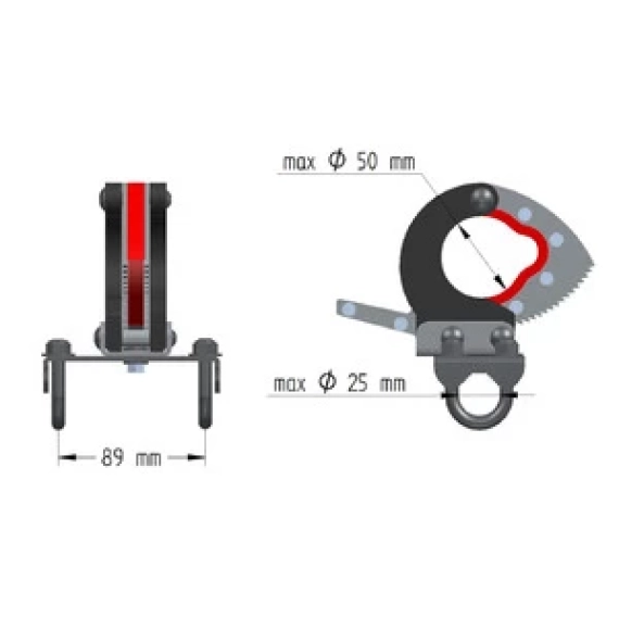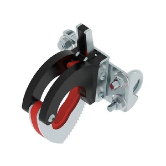 Redskapsholder med hurtiglås.Holderen er i tykk plastikk og bøylen i metall med innlagt gummi for styrke, godt grep og minimere skader på redskapen.