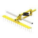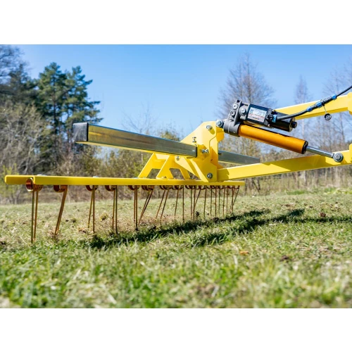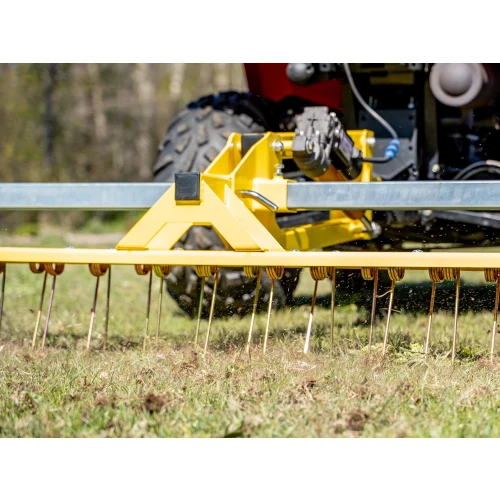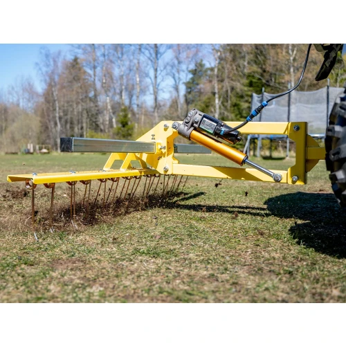 En vertikalskjærer med tinder rykker opp dødt, sammenfiltret gress og fjerner hardpakket jord til planting.